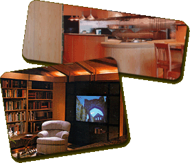 3. Finished kitchen and family room. In the family room, starting from an aged resawn redwood: applied an opaque light color lacquer, followed by glaze, to achieve a lighter tone wood, and client's objective for a lightened room. Kitchen casework lacquered in a "japanned" technique using blue and white to blend with stone countertops.
