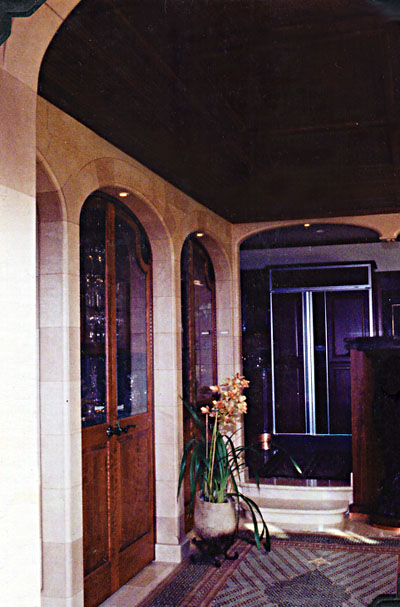 Faux-finished wood (laminated MDF) to blend with limestone floor and table.
