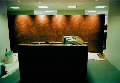 Finished divider to resemble "antique-hammered" bronze metallic wall, behind reception desk.